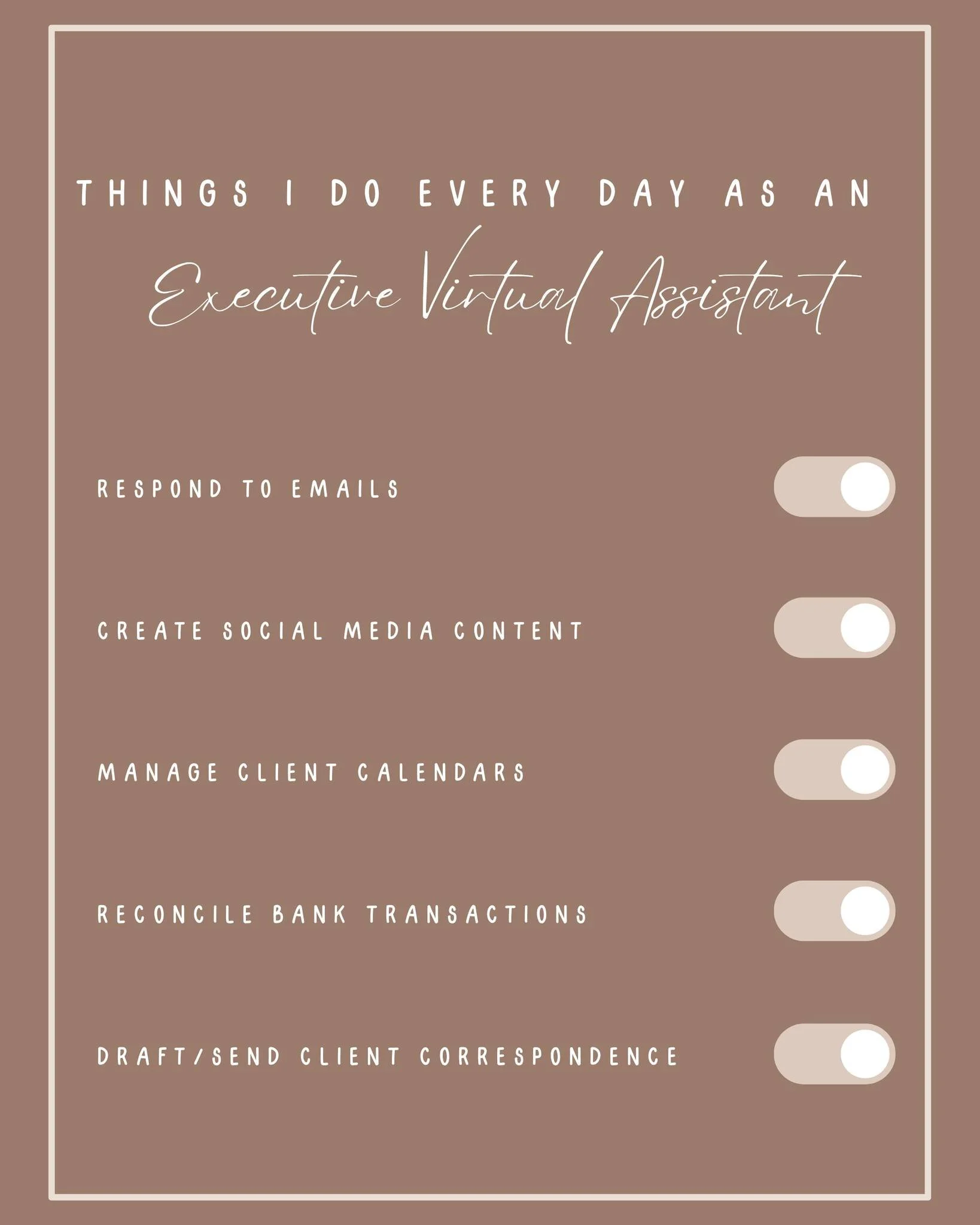 I don’t believe in a one-size-fits-all approach. I will take the time to understand your specific goals and offer customized support that aligns with your priorities. Whether it’s general administrative tasks, or something a little more niche, I’ve got you covered.